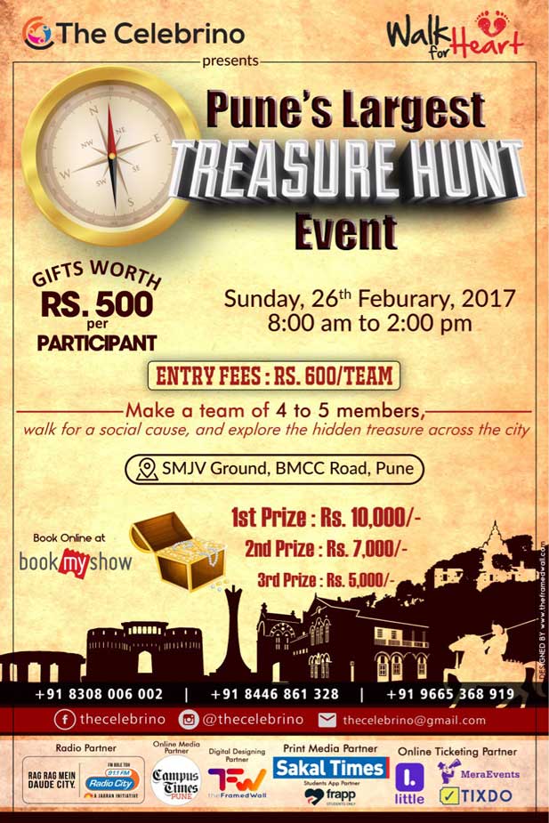 The purpose of this particular event is to let the people of Pune appreciate the unique beauty and charm of the city. Also to encourage pollution free environment taking into consideration the health of the citizens. The treasure hunt covers the forgotten parts of Pune to the to be discovered new areas. This event is not just for fun but for people to discover Pune and themselves as its citizens.