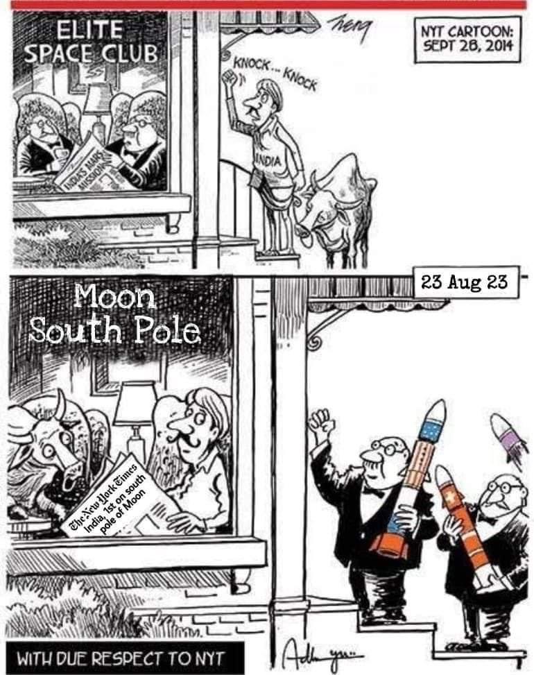 Earlier after the cheapest in its history; Mangalyan Mission by ISRO, New York Times published a cartoon showing an Indian Farmer knocking the doors of Elite Space Club meeting with his cow. Here is the image –